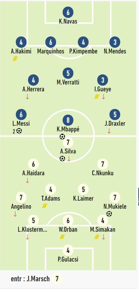 本场比赛《队报》的赛后评分中,巴黎圣日耳曼只有4个球员得到及格分:获得8分的全场最佳姆巴佩,获得6分的梅西、马尔基尼奥斯、纳瓦斯。中后场是低分重灾区,马尔基尼奥斯之外的3个后卫里,金彭贝和右后卫阿什拉夫得到了4分,而左后卫努诺·门德斯只得到3分。